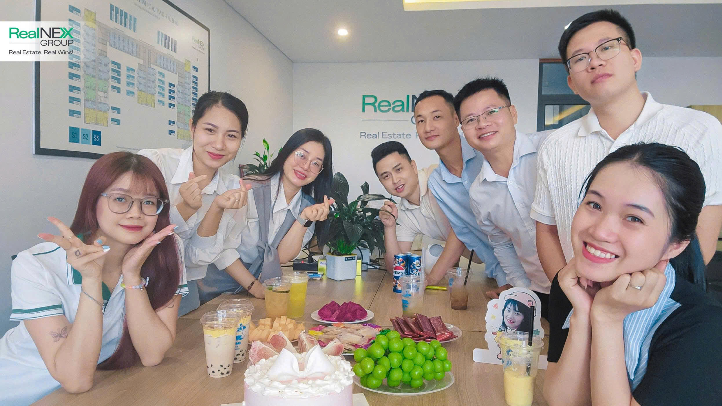Tập thể CBNV RealNEX tại VP trụ sở chính cùng chúc mừng CBNV có sinh nhật trong tháng 8.
